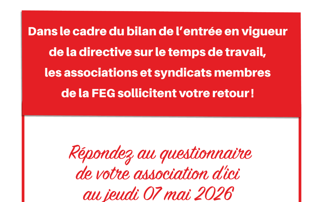 Dans le cadre du bilan de l’entrée en vigueur de la directive sur le temps de travail, les associations et syndicats membres de la FEG, dont la SPG, sollicitent votre retour.