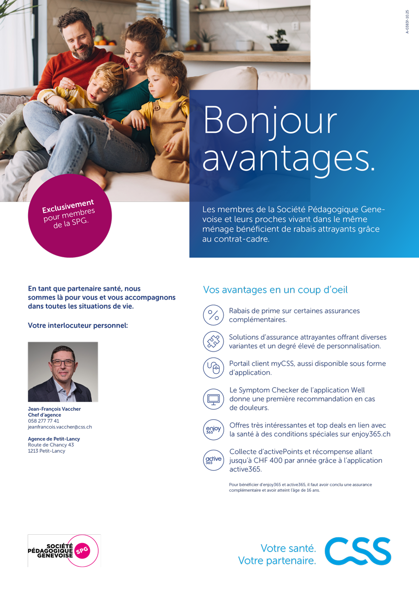 Les membres de la Société Pédagogique Genevoise et leurs proches vivant dans le même ménage bénéficient de rabais attrayants grâce au contrat-cadre passé avec la CSS. Vous pouvez contacter M. Jean-François Vaccher pour discuter de rabais possibles.